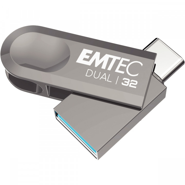 Clé USB 3.2 Emtec Dual 32 Go. Coque en plastique 100% recyclé. Connexion USB-A et USB-C. Petite et compacte, taille 37mm idéale pour transfert des données d'une tablette ou smartphone vers un ordinateur. Compatible 3.2, vitesse d'écriture 20Mo/s, vitesse de lecture jusqu'à 80Mo/s.