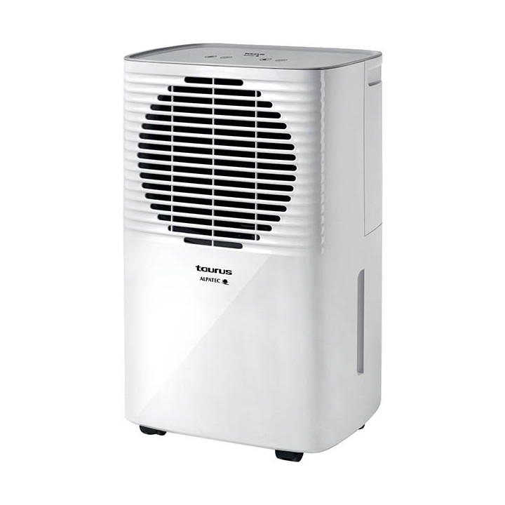 Déshumidificateur 12L blanc. Puissance : 210W Surface traitée jusqu'à 25m2 Capacité de déshumidification 12l / 24H Débit d'air : 90 M3 /h Niveau sonore : 43 dB (A) Capacité réservoir d'eau : 2.5litres Redémarrage AUTO en cas de coupure de courant. Gaz R290 Minuteur : 24h Filtre amovible lavable. Garantie 2 ans