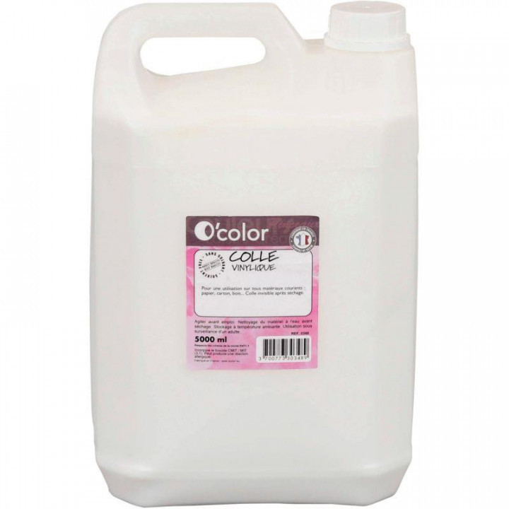 Bidon de colle 5L blanche vinylique. Prise rapide pour un usage scolaire, colle tout papier, carton, cuir etc...Devient transparente au séchage. Ne tache pas et s'enlève facilement sur la peau ou les vêtements avec de l'eau avant séchage.
