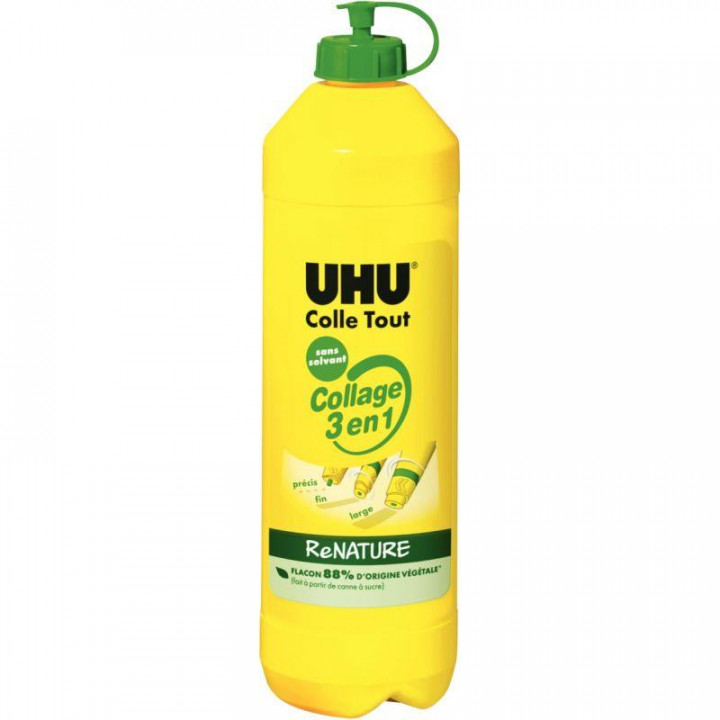 Flacon de colle 810g 3en1 Uhu Renature. Colle adaptée aux élèves et aux enseignants. Universelle, extra forte, transparente et sans solvant. Pour coller carton, papier, feutre, cuir, liège, tissu, bois entre eux ainsi que sur métal, porcelaine, verre, polystyrène expansé et de nombreux plastiques (sauf PE et PP). Permet les rajustements, non inflammable, lavable en machine ou au savon et résistante aux UV.