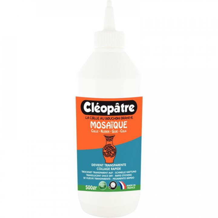 Flacon de colle 500g mosaïque. Idéale pour coller les tesselles de mosaïques et la faïence sur tout type de supports poreux, y compris le médium. Pour les grandes surfaces de collage, elle peut être diluée jusqu’à 10% d’eau afin de retarder le séchage de la colle. Une fois sèche, et après avoir appliqué le joint sur la mosaïque, le collage est durable dans le temps. Son temps de séchage est définitif en 24h, ce qui permet de modifier ou d'ajuster son collage si nécessaire après quelques heures. Après cela, elle adhère durablement et fortement. Son embout de précision permet une application pratique pour contrôler le dosage facilement. Sa consistance épaisse permet de compenser les inégalités de surfaces. Flacon de 500gr.