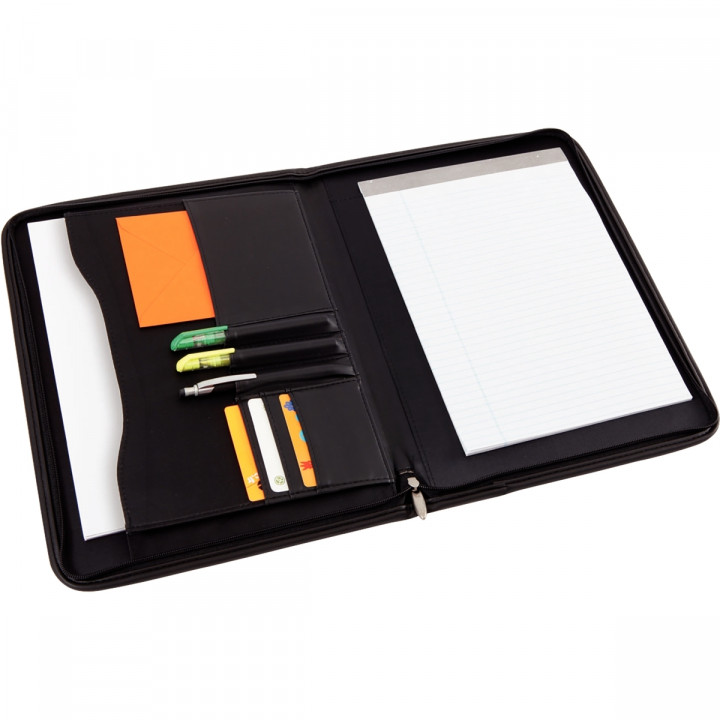 Conférencier A4 avec zip noir. En polyuréthane, composé d’un porte bloc, d’une pochette soufflet pour les dossiers, de petites poches de rangement, de porte stylos et d’une fermeture éclair sur toute la longueur. Livré avec bloc A4. Dimensions : 36x28cm
