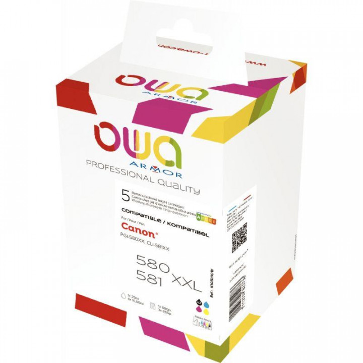 OWA pack de 5 cartouches jet d'encre 2 noire, cyan, magenta et jaune très haute capacité remanufacturées compatibles Canon PGI580 XXL / CLI581 XXL. Garantie 3 ans