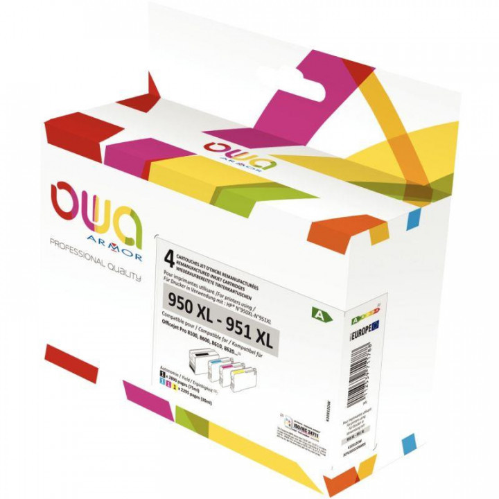 OWA Armor pack de 4 cartouches jet d'encre noire, cyan, magenta et jaune haute capacité compatible HP 950XL / 951XL (C2P43AE). Garantie 2 ans