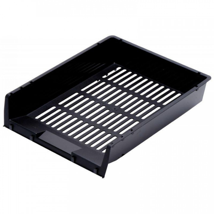 Corbeille à courrier ajourée recyclée noire. Corbeille à courrier en polypropylène couleur noir, superposable verticalement, en escalier et à droite ou gauche, avec porte - étiquette. Dimensions : 330x275x75 mm
