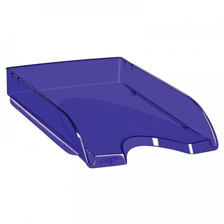 Corbeille à courrier HAPPY violette. Accepte les documents jusqu'au format 24 x 32 cm et les pochettes élastique. Large ouverture à l'avant Ces corbeilles se superposent verticalement ou en escalier. En polystyrène antichoc très robuste et 100% recyclable. Dimensions : 348 x 257 x H. 66 mm