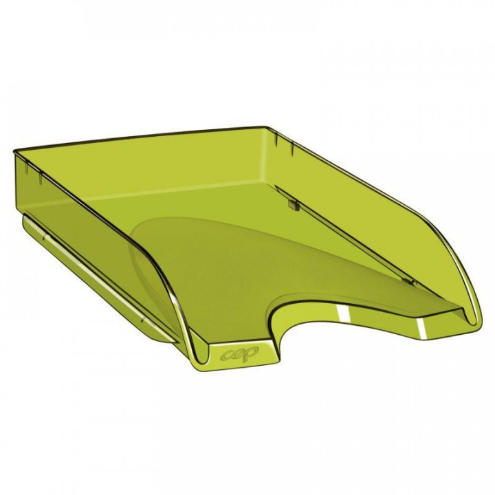 Corbeille à courrier HAPPY verte. Accepte les documents jusqu'au format 24 x 32 cm et les pochettes élastique. Large ouverture à l'avant Ces corbeilles se superposent verticalement ou en escalier. En polystyrène antichoc très robuste et 100% recyclable. Dimensions : 348 x 257 x H. 66 mm