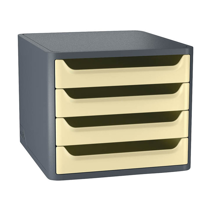 Module 4 tiroirs First Jaune pâle. Style professionnel, élégant et classique. Caisson monobloc robuste. Formes arrondie et parois pleines, esthétiques et solides. Tiroirs équipés d'une grande "boîte aux lettres" pour ranger un document sans avoir à ouvrir le tiroir. Trou de préhension pour faciliter la saisie du contenu. Capacité : 400 feuilles par tiroir (80g). Excellent coulissement avec butées d'arrêt en fin de course. Finition sablée résistant aux rayures.