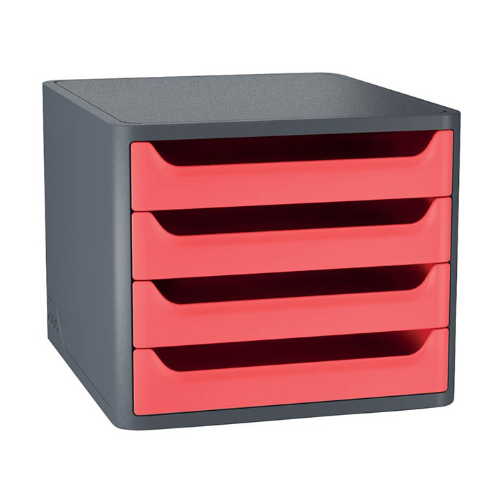 Module 4 tiroirs First Rouge coquelicot. Style professionnel, élégant et classique. Caisson monobloc robuste. Formes arrondie et parois pleines, esthétiques et solides. Tiroirs équipés d'une grande "boîte aux lettres" pour ranger un document sans avoir à ouvrir le tiroir. Trou de préhension pour faciliter la saisie du contenu. Capacité : 400 feuilles par tiroir (80g). Excellent coulissement avec butées d'arrêt en fin de course. Finition sablée résistant aux rayures.