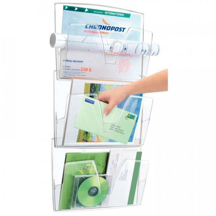 Lot de 3 corbeilles murales transparentes. Pour documents jusque 24x32cm. L'échancrure en "V" permet une excellente préhension des documents. Corbeilles clipsables en grappe. Kit de fixation fourni. Dim d'une corbeille : L.37 x H.27 x P.8,7cm.