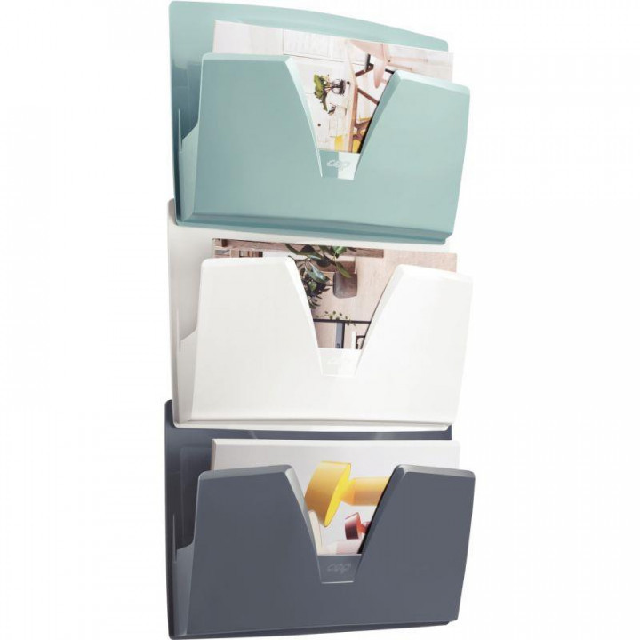 Lot de 3 corbeilles murales Riviera. Lot de 3 corbeilles murales pour documents jusqu’au format 24 x 32 cm et A3 (enveloppes très larges, tubes postaux) grâce aux échancrures sur les côtés. Ouverture évasée sur la paroi avant assurant une excellente préhension des documents, même de petite taille (cartes de visite, enveloppes commerciales). Paroi arrière pleine garantissant un confort d'utilisation, la main ne frotte pas sur le mur lors de la saisie du contenu. Identification facile du contenu : 6 étiquettes adhésives vierges fournies. Les corbeilles peuvent se fixer séparément ou en « grappe » (système de clipsage l'une à l'autre). Kit de fixation fourni. Capacité utile d’une corbeille : 340 feuilles A4 (80 g), 326 x 31 H 240 mm. Supporte jusqu’à 2,5 kg dans une corbeille seule et 5,5 kg dans trois corbeilles accrochées en grappe.