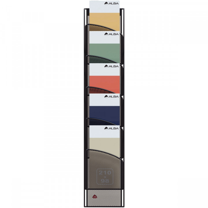 Présentoir mural 5 compartiments 1/3 A4 MESH en métal à la française. Identification immédiate des documents grâce à sa structure filaire 5 compartiments – format DL - 1/3 A4 - 11 x 22 cm (à la française) Orientation portrait Structure en Mesh (Acier perforé) ultra-résistante Facile à nettoyer Dimension produits : L 13 cm x H 63,5 cm x P 8 cm