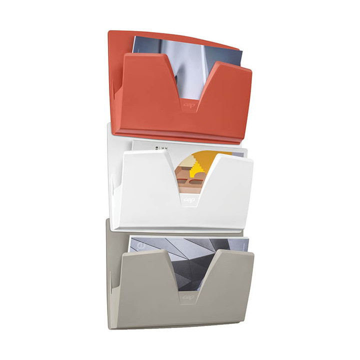 Lot de 3 corbeilles murales TERRA NOVA. Pour documents jusque 24x32cm. L'échancrure en "V" permet une excellente préhension des documents. Corbeilles clipsables en grappe. Kit de fixation fourni. Dim d'une corbeille : L.36.1 x H.27 x P.8,6cm. Garantie 5 ans.