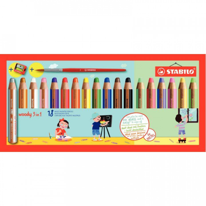 Étui de 18 crayons Woody dont 6 pastels. Contient : 18 woody dont 6 pastel, 1 pinceau rond taille 8 et 1 taille-crayons offerts. Crayon 3 en 1 à la fois crayon de couleur, craie grasse et aquarelle. Son corps large et léger est parfaitement adapté aux petites mains. Sa mine grasse extra tendre et très pigmentée permet de dessiner et écrire sur une multitude de surfaces, telles que le bois, le verre, le plastique, le carton ou encore une ardoise, un tableau noir ou blanc. Sa mine aquarellable se dilue avec un pinceau et de l’eau. Longueur 11cm, diamètre mine 10mm, diamètre crayon 15 mm. Corps rond.