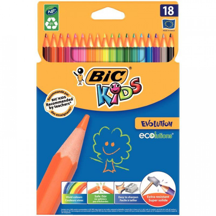 Étui de 18 crayons de couleur Évolution assortis. Crayons de couleurs en résine de synthèse sans bois. Pas d'écharde en cas de bris, mine ultra résistante aux chocs.