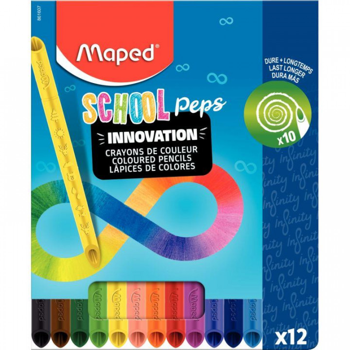 Pochette de 12 crayons de couleur Infinity. 100% mine tendre et résistante. Forme triangulaire. Ils durent en moyenne 10 fois plus longtemps. Pas besoin d’être taillés, ils s’auto affutent en coloriant. Texture Douce et agréable à l‘usage. Couleurs super lumineuses. Zéro déchet. Longueur du crayon : 11,5cm