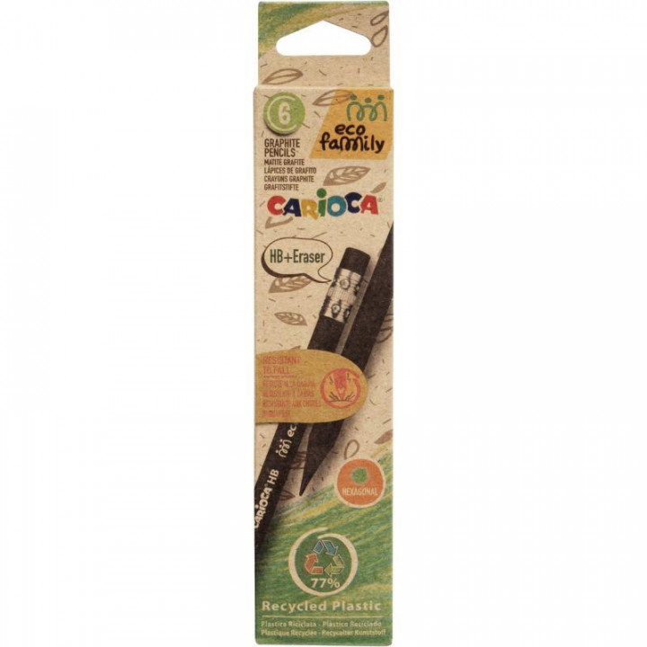 Pochette de 6 crayons graphite Éco family HB bout gomme. Mine super résistante HB de 5 mm avec sa gomme intégrée. Corps hexagonal. Facile à tailler. Corps du crayon avec 77% de plastiques recyclés. Longueur du crayon avec gomme : 18,7cm.