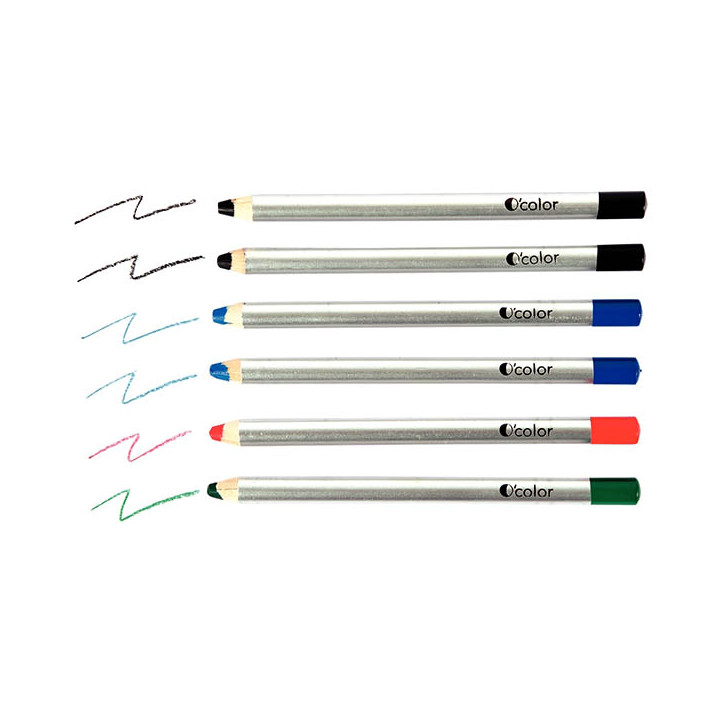 Boîte de 6 crayons O'Color 8mm assortis. Mine semi-grasse aquarellable.Couleurs vives et intenses.Idéal pour les ardoises et tableaux effaçables.Résiste au passage de la main, s'efface au chiffon sec ou d'un simple coup d'éponge ou de chiffon humide. Longueur du crayon : 18 cm. Diamètre de la mine : 8mm. Diamètre du crayon : 12cm.
