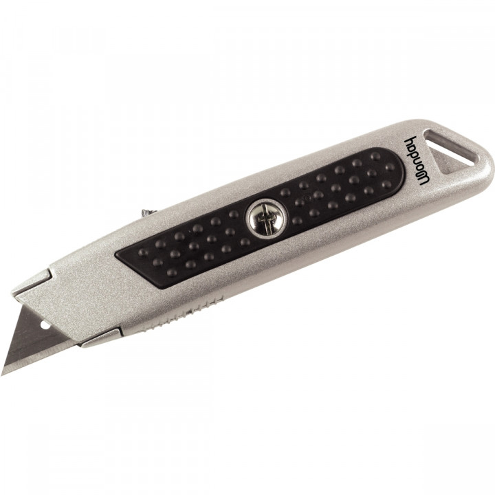 Cutter métal auto-rétractable avec grip. Bi matière.La lame rentre automatiquement dans son logement dès que l'opérateur relâche le poussoir.Pour droitier et gaucher