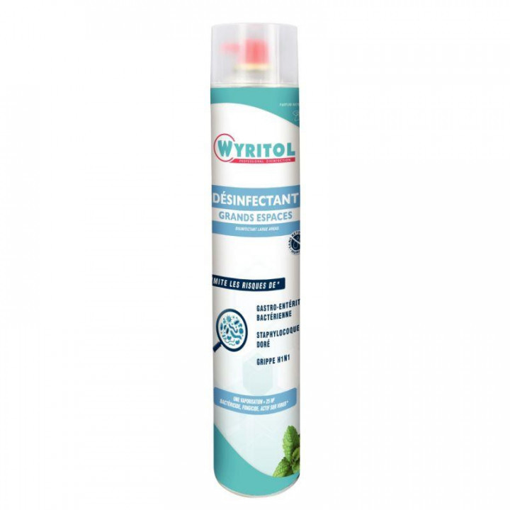 Aérosol 750ml désinfectant grand espace menthe. Avec buse gros débit. 1 vaporisation = 25m² Sans retombées humides. Actif sur virus. - Purifie l'atmosphère - Désinfecte les objets et surfaces - Neutralise les mauvaises odeurs - Bactéricide, fongicide, actif sur virus