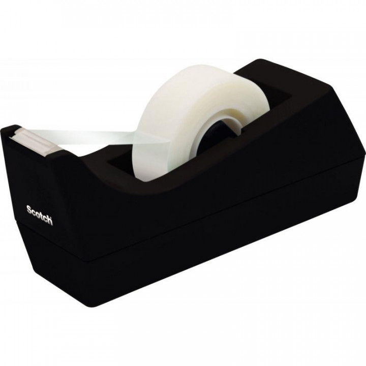 Dévidoir de Bureau C38 noir. Livré sans rouleau adhésif. Un dévidoir lesté pour dérouler et couper le ruban facilement à une seule main Lame coupante en métal pour distribuer facilement différentes sortes de rubans Le ruban se déroule en douceur, sans striure et se coupe facilement Tampon en caoutchouc antidérapant sur le socle pour une utilisation pratique et un bureau protégé Facile à recharger, le dévidoir peut accueillir des rubans allant jusqu'à 19 mm x 38 m sur une bague de 2,54 cm de diamètre 100 % plastique recyclé