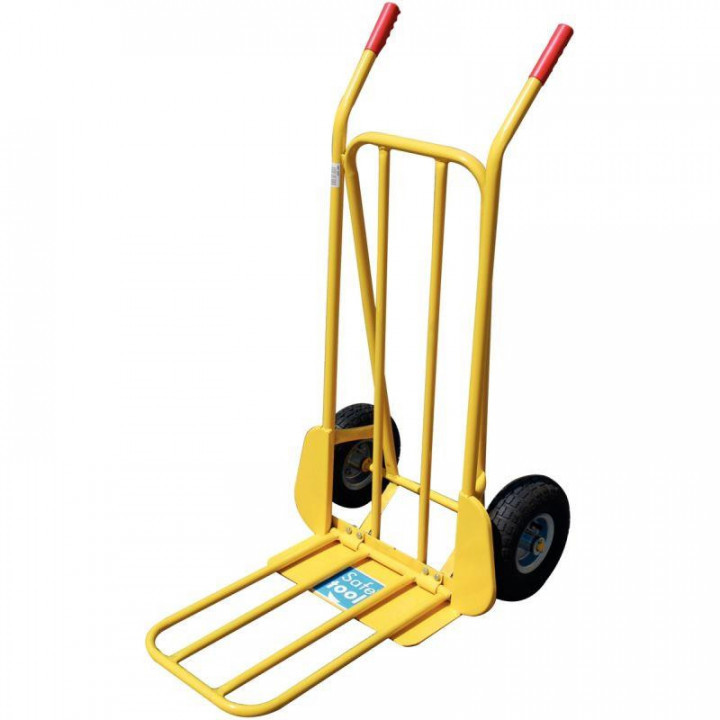 Diable en acier 250kg. 2 roues gonflables. 1 bavette fixe 125x415mm, 1 bavette rabattable 350x530mm.