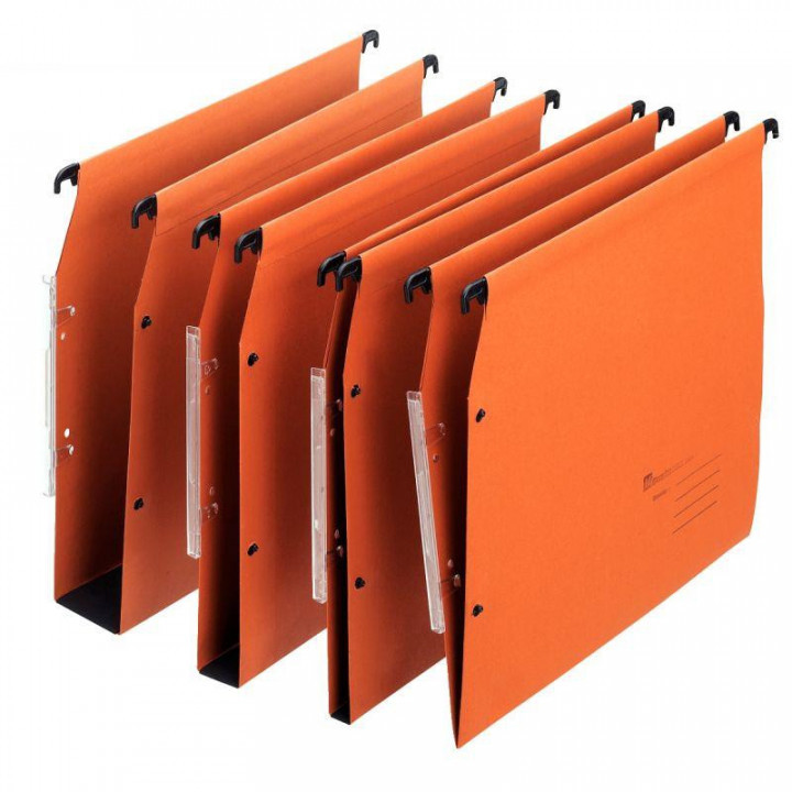 Paquet de 25 dossiers suspendus économiques pour armoires, dos 50 mm, coloris orange. Dossiers en kraft standard 230 g. Double mise en continu par volet d'agrafage et boutons pression métal. Porte-étiquette transparent à effet loupe.