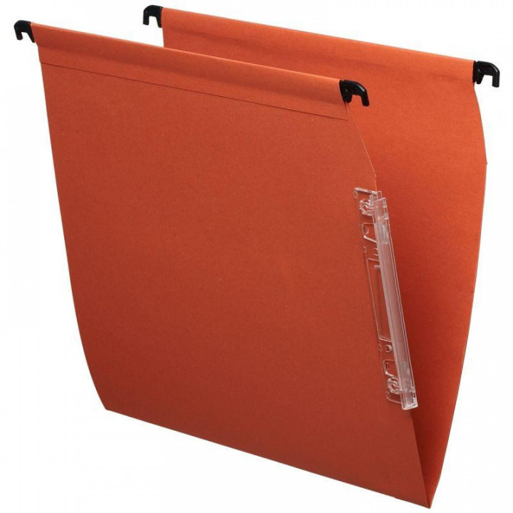 Paquet de 25 dossiers suspendus en kraft recyclé 230g pour armoire, dos V. Dossiers en kraft orange recyclé 230g. Mise en continu par volet d'agrafage. Barrettes de suspension en métal. Porte-étiquette transparent à effet loupe. Entraxe 330 mm.