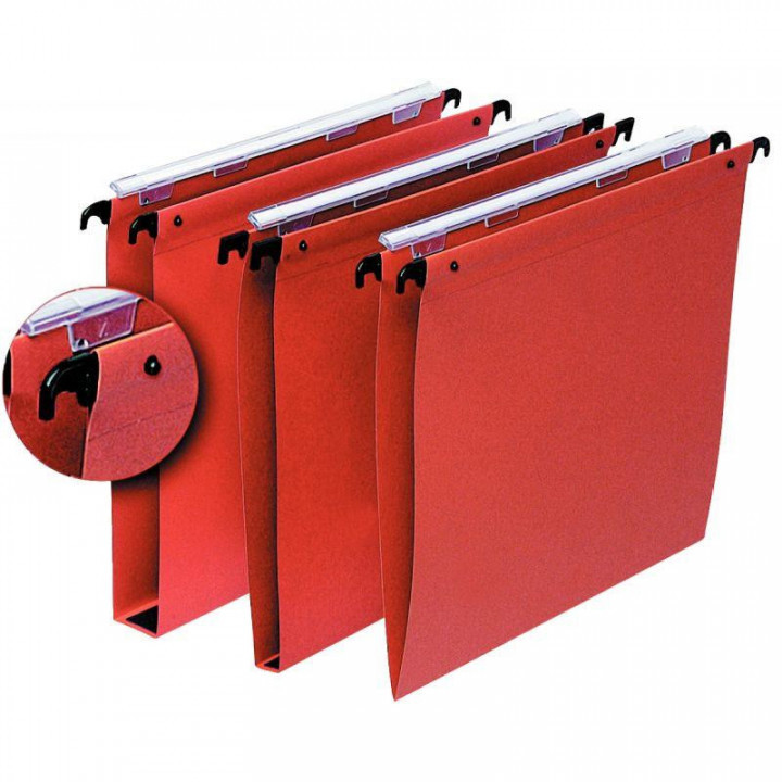 Paquet de 25 dossiers suspendus économiques pour tiroirs, dos V, coloris orange. Kraft orange 230 g. Double mise en continu par volet d'agrafage et boutons pression métal. Porte-étiquette à effet loupe.