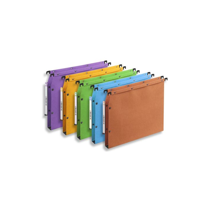 Carte exclusive 240 g/m², 100% pure pâte renforcée par des fibres de coton pour une solidité maximale. Système d'assemblage jupe/barrette unique par rivet métal anti-déchirure. Grand porte-étiquette effet loupe, offrant 50% de visibilité en plus. Mise en continu par boutons-pression métal. Utilise les planches n° 9. Format A4, entraxe 330 mm.