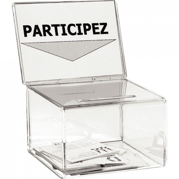 Urne avec porte-affiche A6 16x19,5x11cm. Fabrication plexiglass transparent d'épaisseur 4mm. Ouverture à l'arrière par coulissement du porte-affiche. Dimensions du porte affiche : H.10.5 x L.15cm. Dimension de la fente : L.8.6 x L0.6cm. Capacité : 200 bulletins.