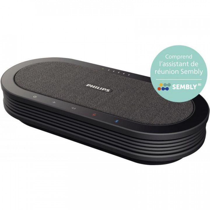Philips micro de table réseau/BT. Microphone de conférence sans fil avec assistant de réunion Sembly. Prise de note automatique, résumés de réunions instantanés, son haute qualité. 6 microphones, 4 haut-parleurs (4 x 5W), batterie Li-ion 5000mAh, autonomie jusqu'à 10 heures, temps de charge 4 heures. Connectivité USB-C 2.0, bluetooth 5.0. Systèmes d'exploitation macOS 12, Windows 10 et versions ultérieures.