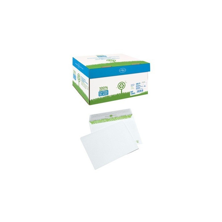 Papier certifié 100% recyclé. Les encres et les colles sont exclusivement à l'eau. Les fenêtres sont en papier cristal NF environnement et homologué par La Poste. La boite de 500 enveloppes est en carton recyclé, et est refermable.