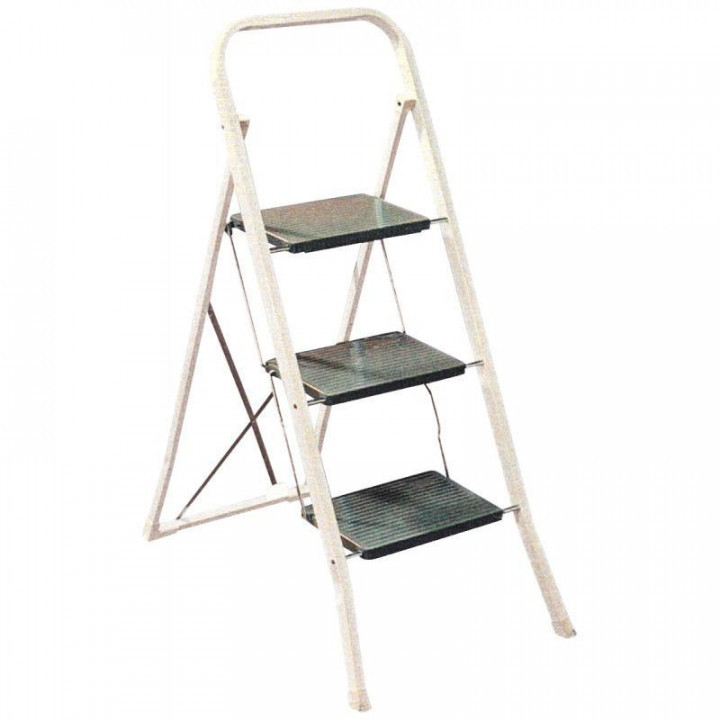 Marchepied 3 marches. Structure en tubes d’acier de section rectangulaire, 20 x 30 mm pour les jambes avant et 15 x 20 mm pour les jambes arrières. Verrou de sécurité. Marches 20 x 30 cm en tôle d’acier emboutie striée antidérapante. Finition laque époxy. Patins en plastique de protection de sol antidérapants, charnières renforcées. Extra plat une fois plié. Conforme aux exigences sécuritaires de l’annexe N° 1 du décret N° 96-333 et de la norme EN 14183-B3. Charge maximale admissible : 150 kg. Hauteur de travail (pour une personne de taille moyenne positionnée sur la marche la plus haute, bras levé) : 2.70m. Hauteur de la plateforme : 0.70m. Hauteur de rangement : 1.14m. Largeur : 0.67m. Poids : 5,6kg.