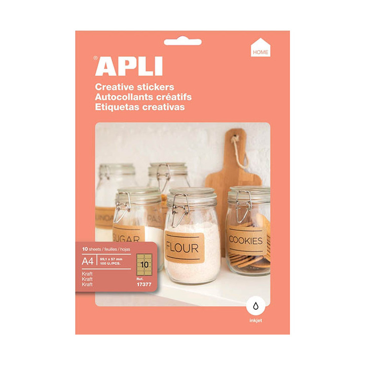Paquet de 10 feuilles étiquettes kraft rectangulaires format 99.1x57mm. Etiquettes couleur kraft rectangulaires avec coins arrondis dimensions 99,1 x 57 mm avec un adhésif permanent. Paquet de 100 étiquettes, 10 feuilles A4 de 10 étiquettes par feuille A4. Idéal pour étiqueter les pots, dossiers, carnets, boites, cadeaux, invitations etc. Excellente qualité d’impression aux imprimantes jet d'encre. Téléchargez le logiciel gratuit pour créer et imprimer tout type d’étiquettes sur www.apli.fr.
