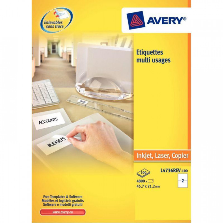 Pochette de 1200 étiquettes blanches enlevables 45,7x21,2mm. La pochette de 25 feuilles A4. Coins arrondis. Adhèrent parfaitement et faciles à enlever si nécessaire, sans laisser de traces de colle. Pour impression laser, comptable laser couleur et jet d'encre. Codes produits dans MS Word. Modèles et logiciel gratuits sur www.avery.fr.