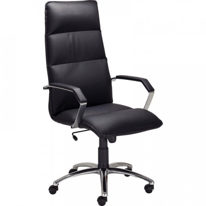 Siège président Sienne cuir noir. Mécanisme basculant centré réglable en intensité et blocable. Piètement en fonte d'aluminium poli. Accoudoirs design en acier chromé. Revêtement en croûte de cuir vachette. Assise: L48xP45cm. Haut dossier: H65cm. Hauteur d'assise réglable de 38 à 52cm. Densité mousse assise/dossier 30kg/m3. Equipé de roulettes sol moquette. Normes NF EN 1335. Pour utilisateur jusqu'à 110 kg. Garantie 3 ans.