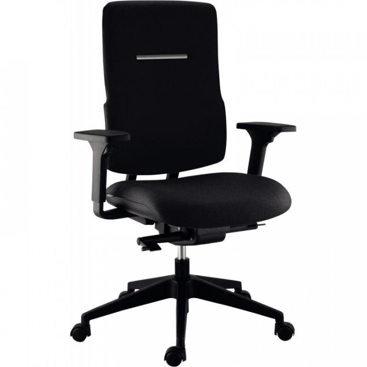 Siège manager Erga avec translation d'assise noir. Mécanisme synchro plus, avec grand angle d'ouverture 22°, blocable 5 positions. Réglage manuel de l'intensité du basculement en fonction du poids de l'utilisateur. Sécurité anti retour. Translation d'assise activée par un bouton. Haut dossier tissu H60xL47cm. Mousse découpée épaisseur 25mm densité 30kg/m3. Support lombaire réglable sur 5cm pour un meilleur confort. Assise L50,5xP49cm. Mousse injectée épaisseur 5cm densité 70kg/m3. Hauteur d'assise réglable de 44 à 56cm. Accoudoirs réglables 3D avec manchettes sort confort: hauteur (+/- 75mm) 9 positions, avant/arrière (+/- 50mm), largeur (+/- 70mm). Piètement avec roulettes double galet en polyamide armé noir Ø50mm. Pour utilisateur jusqu'à 110kg. Garantie 5 ans.