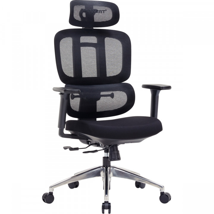 Fauteuil RG600F mesh noir. Mécanisme synchrone multifonctions verrouillage 4 positions. Vérin classe 4. Dossier réglable en hauteur. Renfort lombaire réglable. Assise en tissu et dossier en mesh. Assise en mousse densité 55kg/m3. Translation d’assise sur 7cm. Accoudoirs réglables 3D inclus. Tétière réglable 3D inclue. Piétement en Aluminium Chromé. Roulettes diamètre 60mm. Pour utilisateur Jusqu’à 120 Kg. Garantie 5 ans.