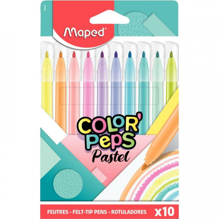 Pochette de 10 feutres Colorpeps pastels assortis. Pointe conique de 2,8 mm. Feutres aux couleurs pastel. Pointe bloquée haute résistance. Encre lavable, résiste au séchage jusqu'à une semaine sans capuchon avec capuchon transparent.