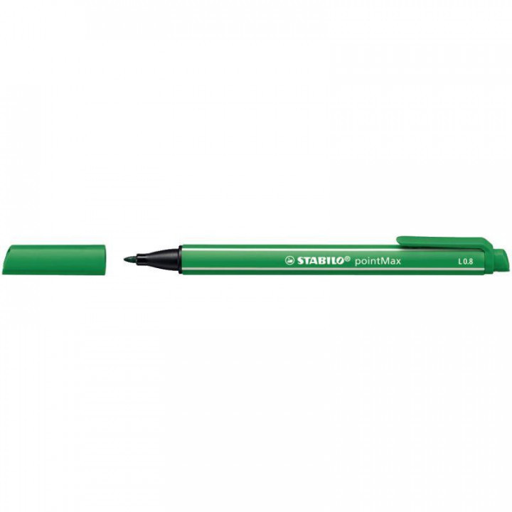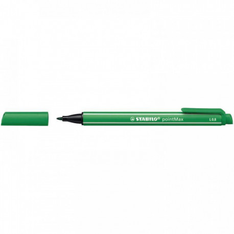 Feutre Pointmax vert. Ecriture moyenne, tracé de 0,8 mm. Pointe nylon ultra robuste et multi-usages. Encre à base d'eau. Peut rester ouvert 24h sans sécher. Corps et clip à la couleur de l'encre.