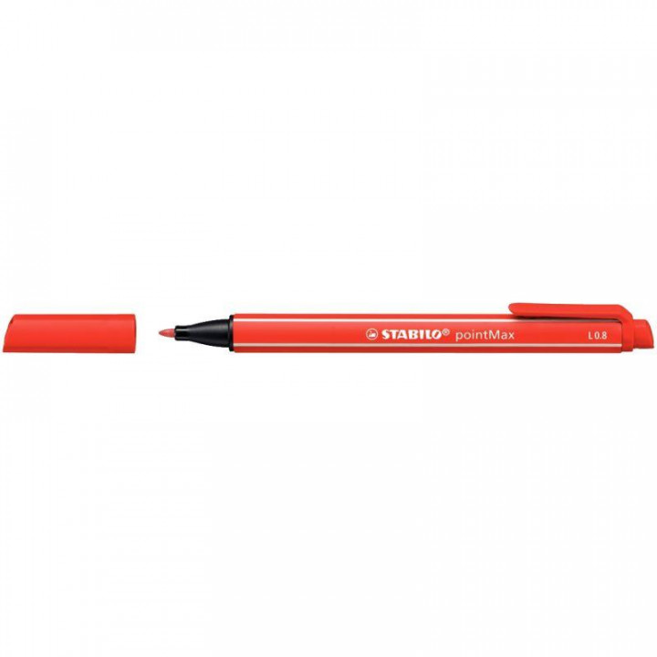 Feutre Pointmax rouge. Ecriture moyenne, tracé de 0,8 mm. Pointe nylon ultra robuste et multi-usages. Encre à base d'eau. Peut rester ouvert 24h sans sécher. Corps et clip à la couleur de l'encre.