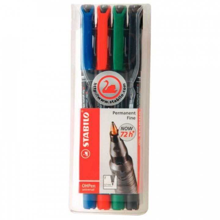 Pochette de 4 feutres OhPen permanent 0,7mm assortis. Bleu, noir, rouge et vert. Idéal pour toutes les surfaces lisses. L'encre est indélébile.