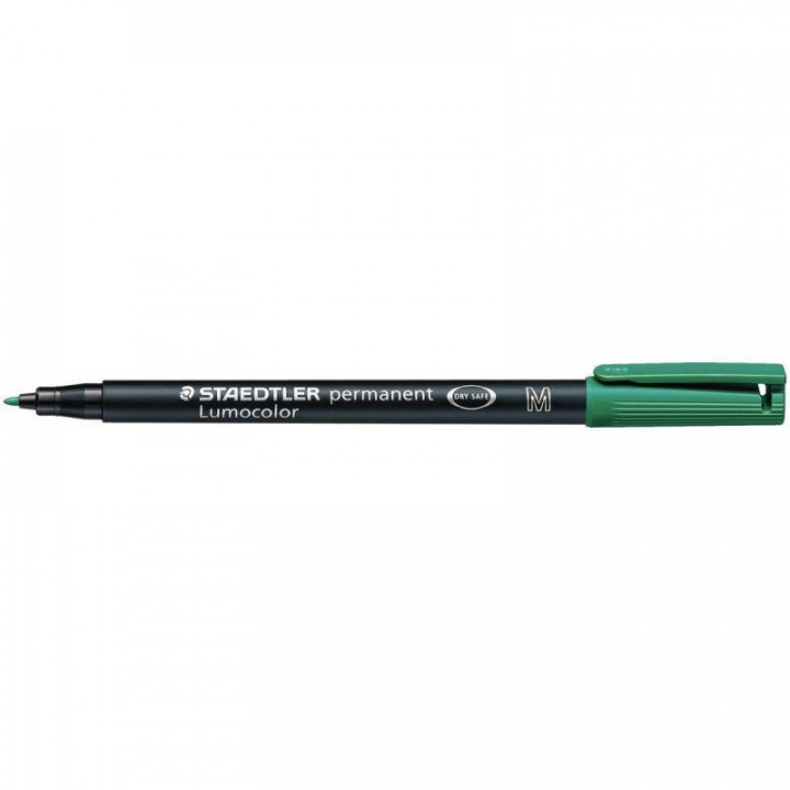 Feutre Lumocolor permanent 1,0mm vert. Pour la rétroprojection et la plupart des surfaces, encre permanente dry safe permettant de laisser décapuchonné plusieurs jours sans sécher (ISO 554), ne bave pas, quasi inodore, résistant à l'eau sur presque toutes les surfaces, séchage rapide sur le support idéal pour les gauchers, avec clip, corps et capuchon en polypropylène garantissant une longue durée de vie, rechargeable, pointe moyenne 1,0 mm.