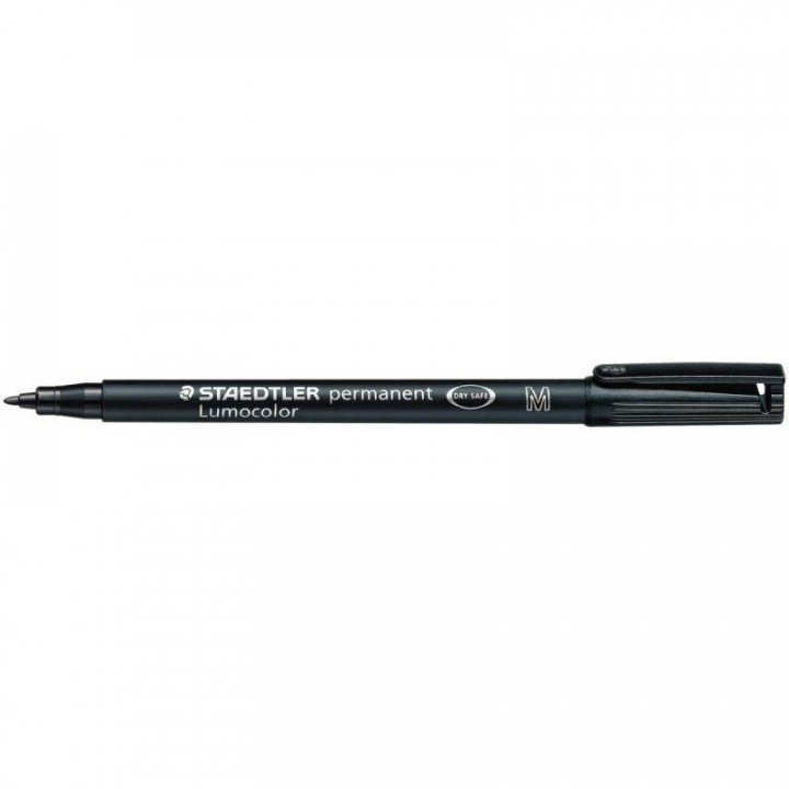 Feutre Lumocolor permanent 1,0mm noir. Pour la rétroprojection et la plupart des surfaces, encre permanente dry safe permettant de laisser décapuchonné plusieurs jours sans sécher (ISO 554), ne bave pas, quasi inodore, résistant à l'eau sur presque toutes les surfaces, séchage rapide sur le support idéal pour les gauchers, avec clip, corps et capuchon en polypropylène garantissant une longue durée de vie, rechargeable, pointe moyenne 1,0 mm.