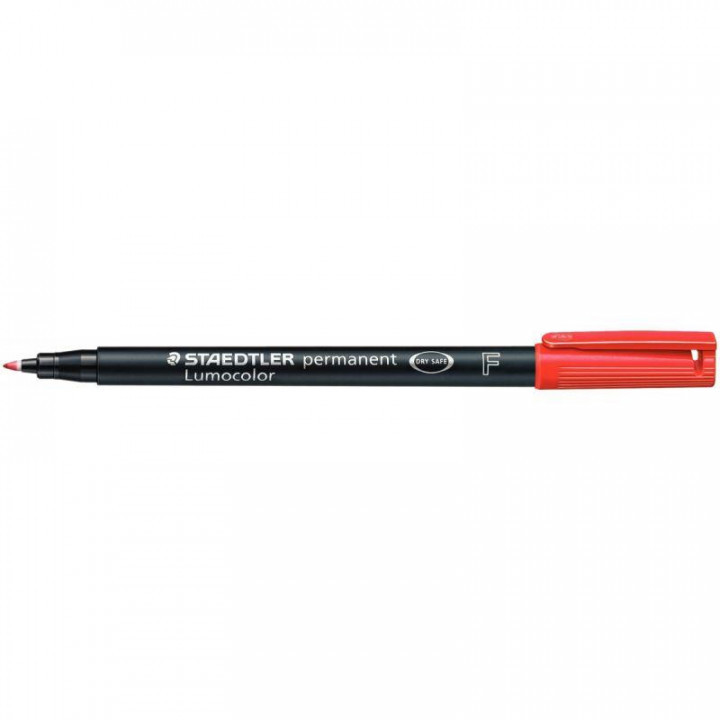Feutre Lumocolor permanent 0,6mm rouge. Pour la rétroprojection et la plupart des surfaces, encre permanente dry safe permettant de laisser décapuchonné plusieurs jours sans sécher (ISO 554), ne bave pas, quasi inodore, résistant à l'eau sur presque toutes les surfaces, séchage rapide sur le support idéal pour les gauchers, avec clip, corps et capuchon en polypropylène garantissant une longue durée de vie, rechargeable, pointe fine 0,6 mm.