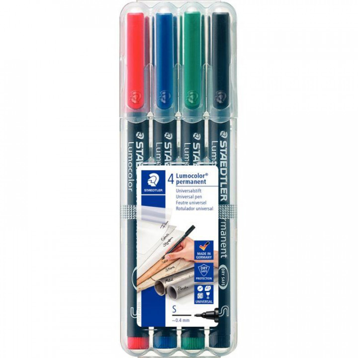 Pochette de 4 feutres Lumocolor permanent 0,4mm assortis. Pour la rétroprojection et la plupart des surfaces, encre permanente dry safe permettant de laisser décapuchonné plusieurs jours sans sécher (ISO 554), ne bave pas, quasi inodore, résistant à l'eau sur presque toutes les surfaces, séchage rapide sur le support idéal pour les gauchers, avec clip, corps et capuchon en polypropylène garantissant une longue durée de vie, rechargeable, pointe superfine 0,4 mm.