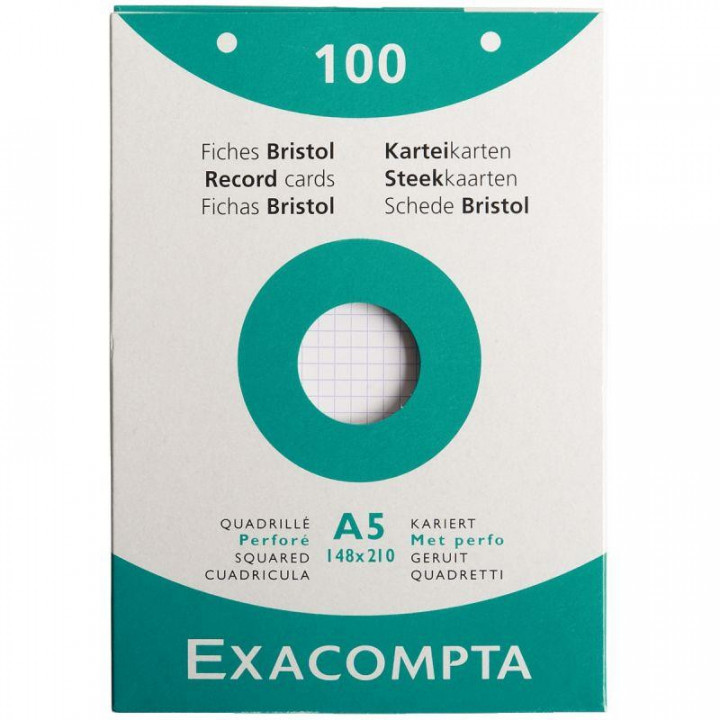 Etui de 100 fiches bristol perforées carte forte 205 g blanc quadrillé 5x5 format 14,8 x 21 cm. Rigide et solide, leur surface très lisse permet une écriture aisée. Présentation sous étui carton rigide.