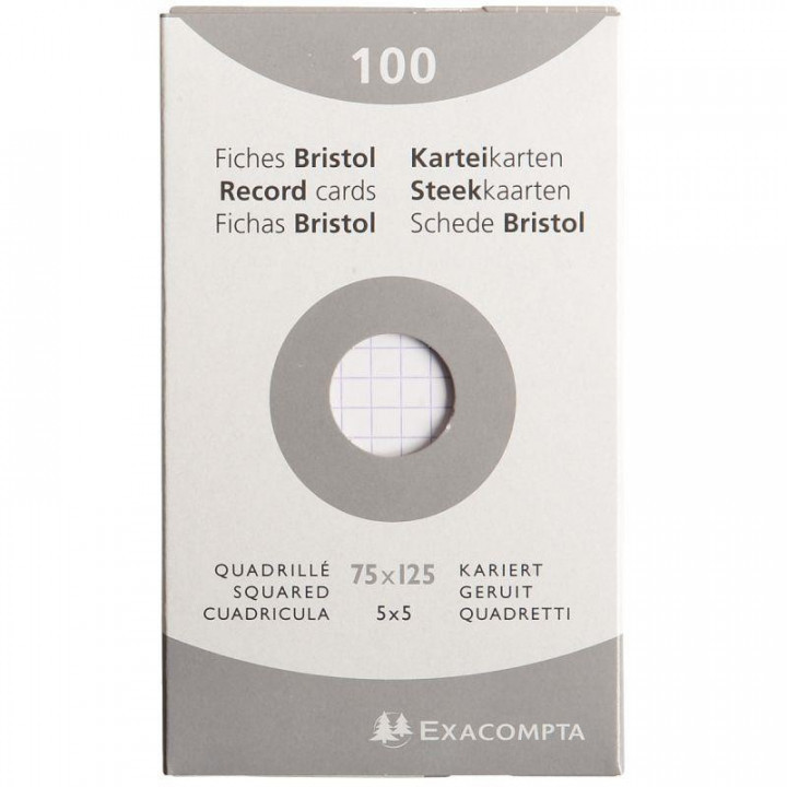 Etui de 100 fiches bristol non perforées carte forte 205 g blanc quadrillé 5x5 format 7,5x12,5 cm. Rigide et solide, leur surface très lisse permet une écriture aisée. Présentation sous étui carton rigide.PEFC.