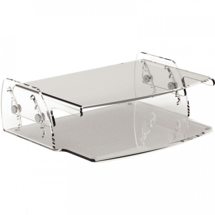 Support écran ajustable Clarity. 5 réglages en hauteur: entre 7cm et 13cm. Supporte jusqu'à 10kg. Dim: L25,6xP32xH7cm. En acrylique: ép. 5mm.
